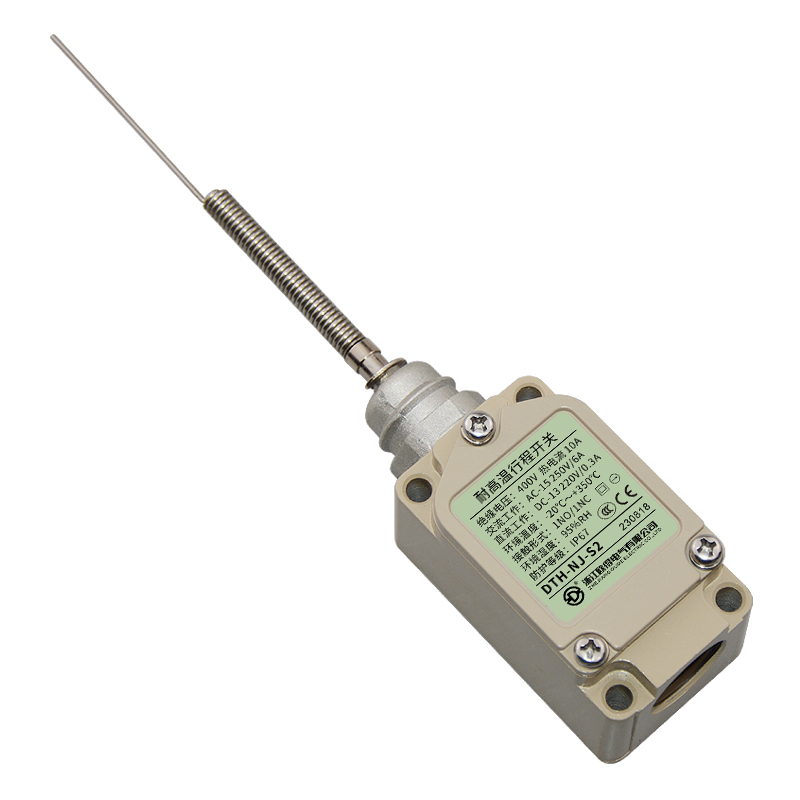 DTH-NJ-S2耐高温行程开关,顶端钢针·盘簧棒型,万向式、通用直立型,长寿命2回路限位开关。适用于钢铁、焦化、电厂、纺织、医疗、化工、铝材、塑料、玻璃、轮胎等高温加工机械设备,作位移电路通断信号检测控制。