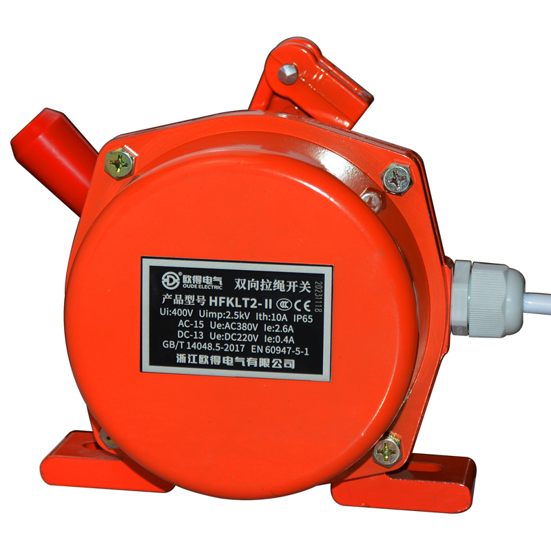 HFKLT2-Ⅱ双向拉绳开关,是用于胶带运输机现场,紧急事故停机的一种保护装置。当紧急事故发生时,在现场任意处启动拉绳开关,均可发出停机信号。绝缘电压400伏,发热电流10安培,工作电压电流交流380伏、2.6安培,直流220伏、0.4安培,防护等级IP65。