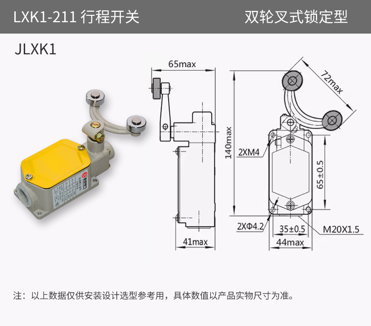 JLXK1-211行程开关,双轮叉式锁定型,2回路,1常开1常闭,欧得限位开关。该行程开关适用于绝缘电压400伏、发热电流10安培、交流工作电压380伏电流0.8安培、直流工作电压220伏电流0.15安培的控制电路中,将机械信号转变为电气信号,用来控制机械运动的行程、速度或程序控制。