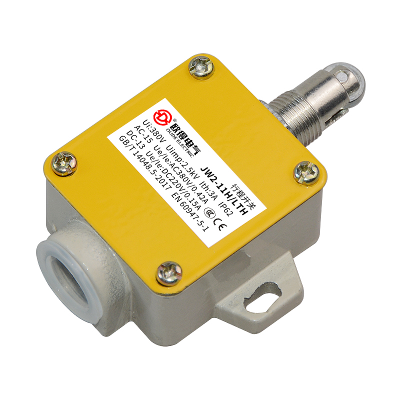 行程开关(JW2-11H/LTH),滚轮柱塞直动式。绝缘电压380伏,发热电流3安培,交流工作电压380伏、电流0.42安培,直流工作电压220伏、电流0.15安培,防护等级IP62。