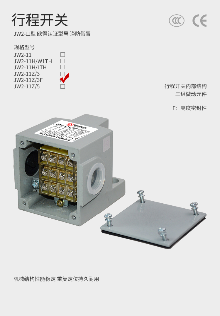 防水行程开关(JW2-11Z/3F),三组滚轮柱塞直动式,高度密封性。绝缘电压380伏,发热电流3安培,交流工作电压380伏、电流0.42安培,直流工作电压220伏、电流0.15安培,防护等级IP62。